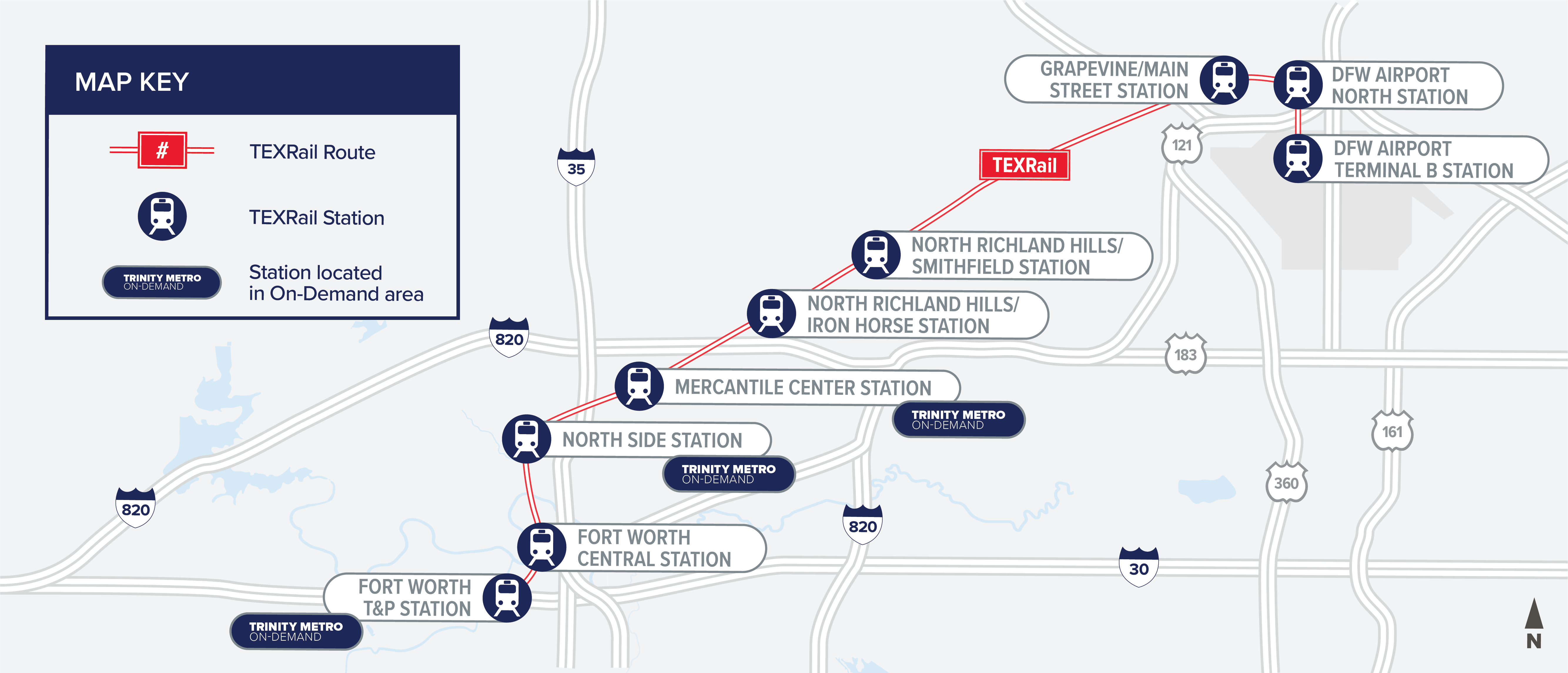 Get the GuideTrinity Metro TEXRail is a 27-mile commuter train connecting riders from Terminal B of Dallas Fort Worth International (DFW) Airport to Grapevine Main Station, North Richland Hills and Downtown Fort Worth.